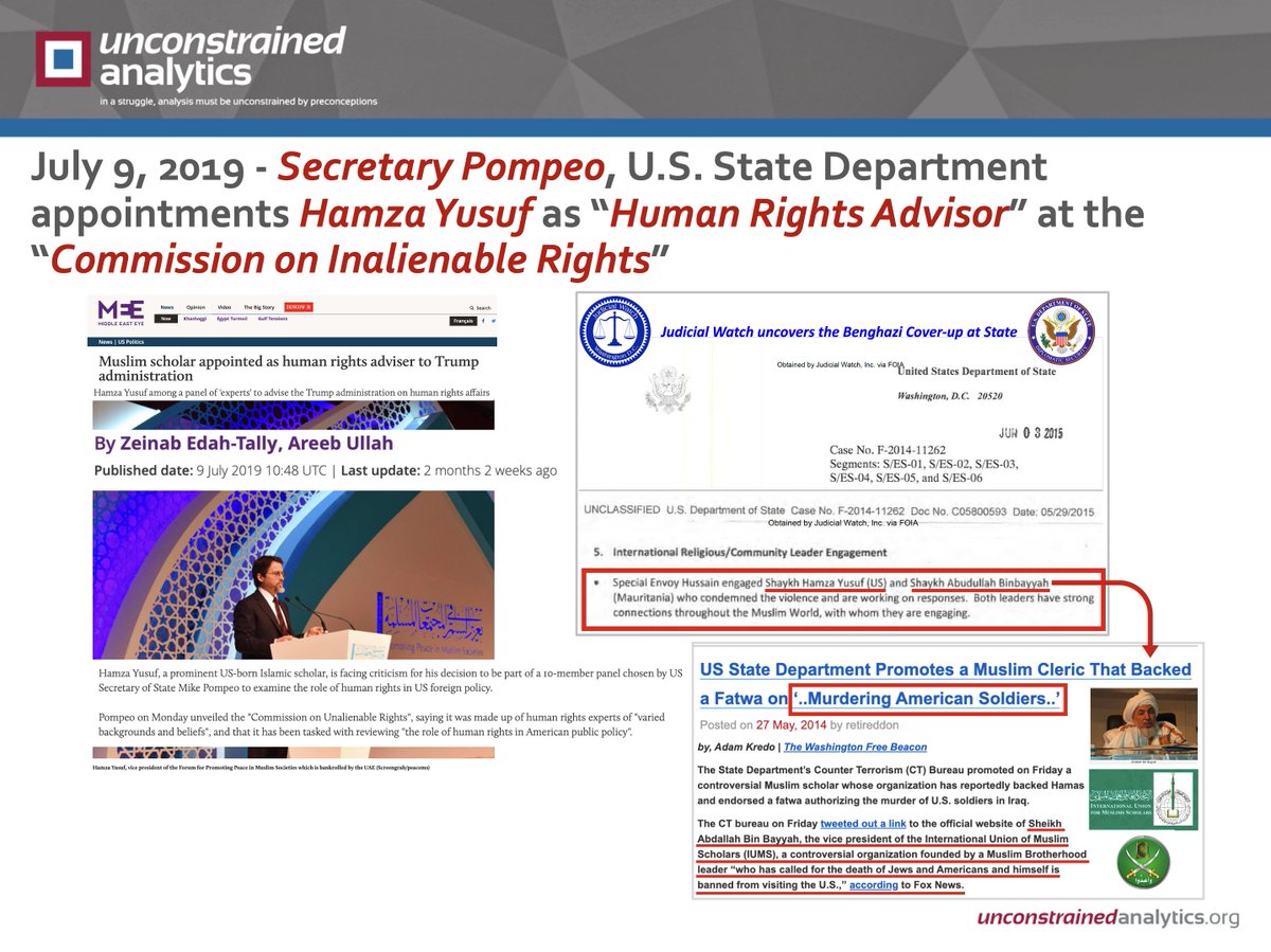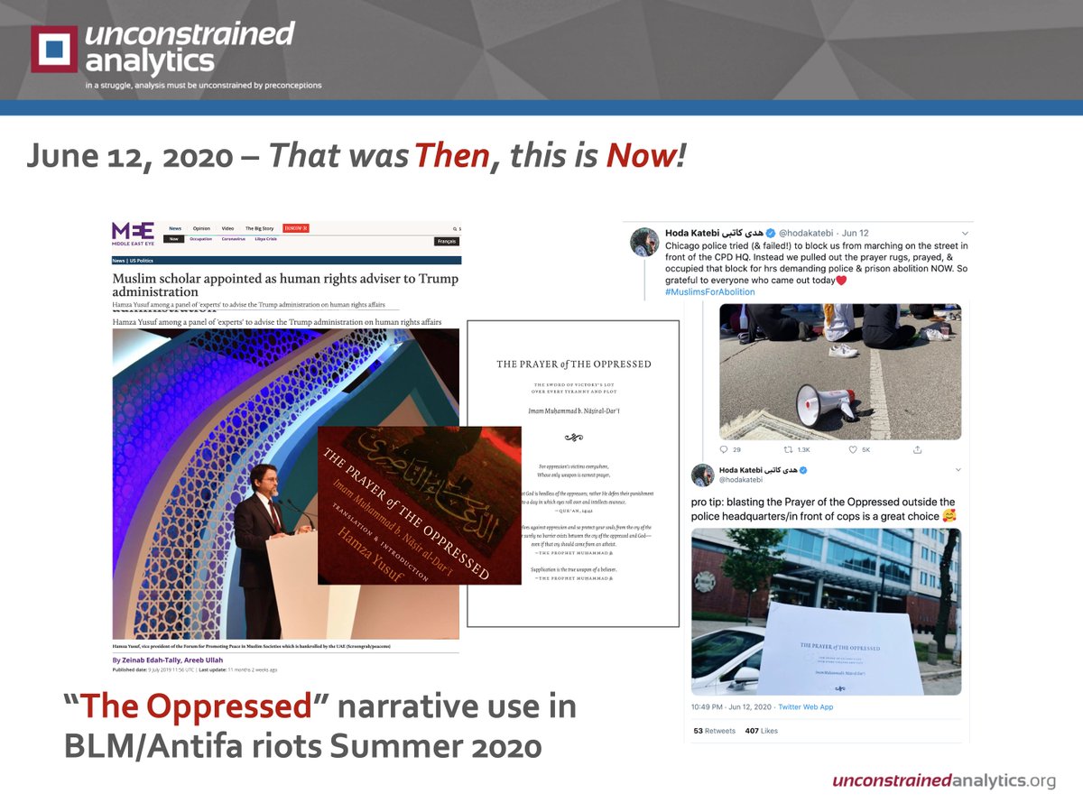 Early on, reference is made to the “cry of the oppressed.” This might ring a faint bell. When BLM and Antifa were rioting in American cities in June 2020, they were screaming from the “prayer of the oppressed,” a booklet recently translated and published by Hamza Yusuf, that same Hamza Yusuf that Sec State Pompeo appointed as “Human Rights Advisor” on State’s “Commission on Inalienable Rights” a month later. These violent riots were directed at President Trump in his first term.