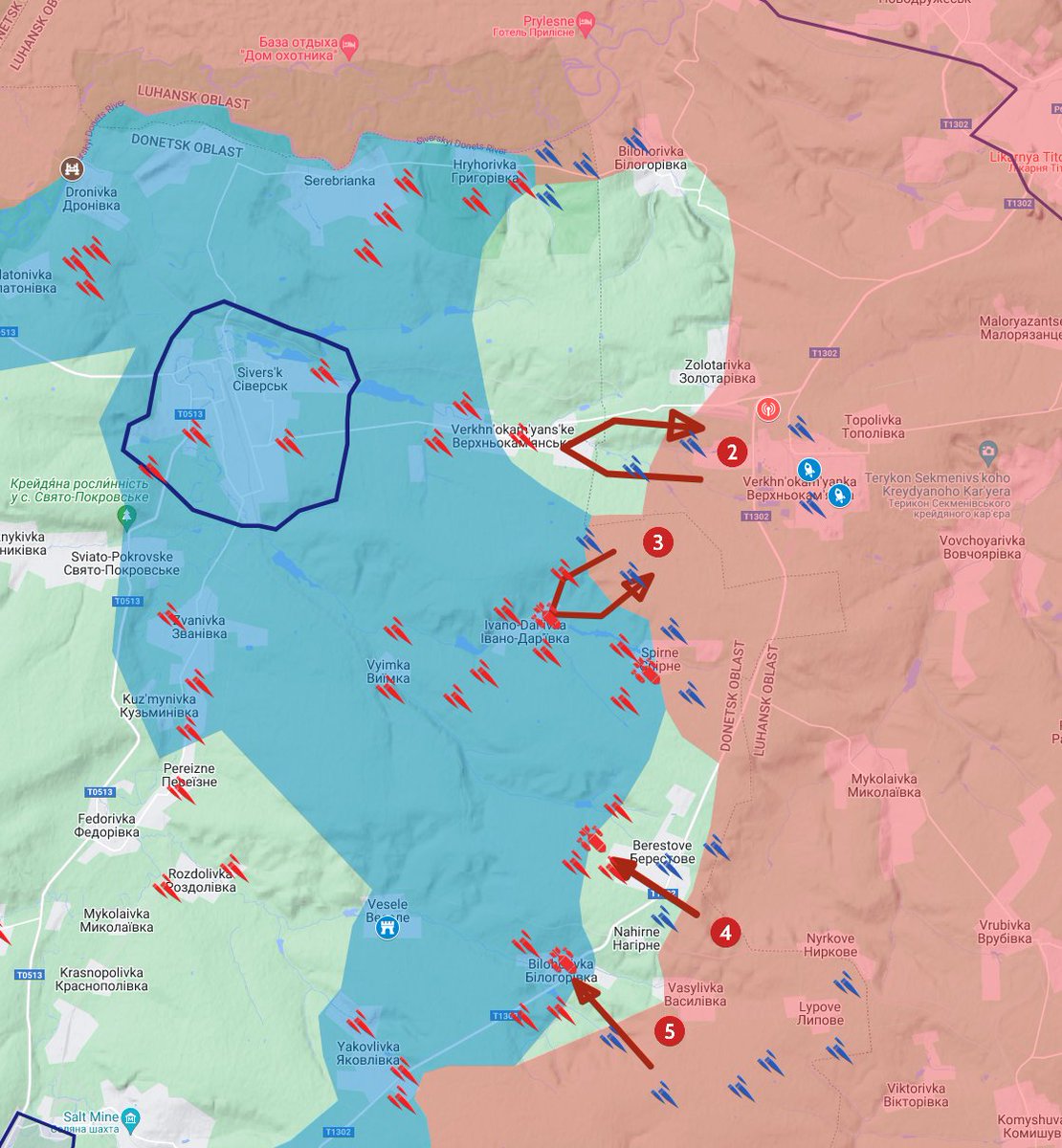 The Siversk area: Russia is still trying to capture Berestove after Ukraine abandoned it a few days ago, but they are getting absolutely mauled by artillery strikes (4). They are also attacking Bilohorivka with the same result (5).