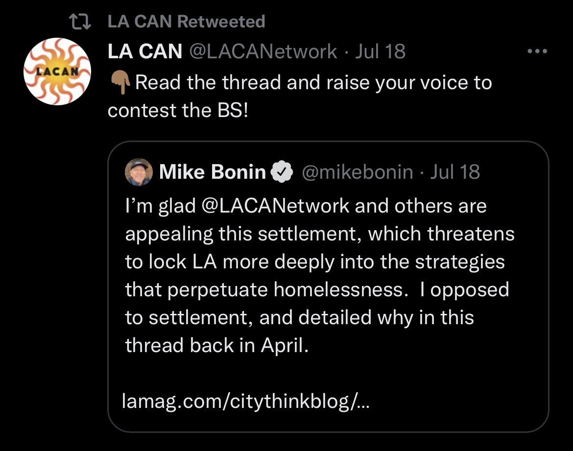 Further, Mike Bonin, along with powerful organizations like the Los Angeles Community Action Network, are fighting the legal settlement that requires Los Angeles to build 16,000 new shelter beds over the next 5 years. 6/12
