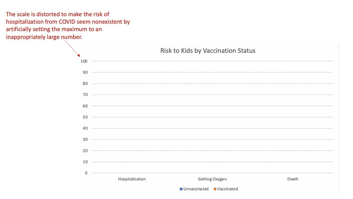 You can't even see the data (which seems to be the intended point.) This graph misleadingly suggests that the risk of hospitalization by COVID for kids is *so small* that getting vaccinated or not doesn't matter. It's basically 0!