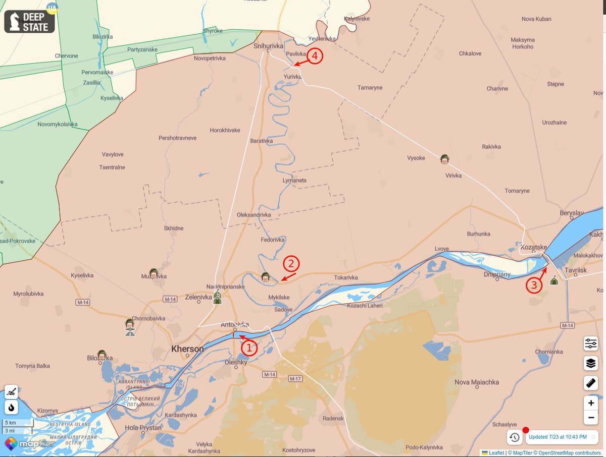 Kherson: After damaging Antonovsky bridge (1), 🇺🇦 artillery damaged bridge near Darivka (2), leaving 🇷🇺 supplies coming through Nova Khakovka dam (3) and Snihurivka (4).