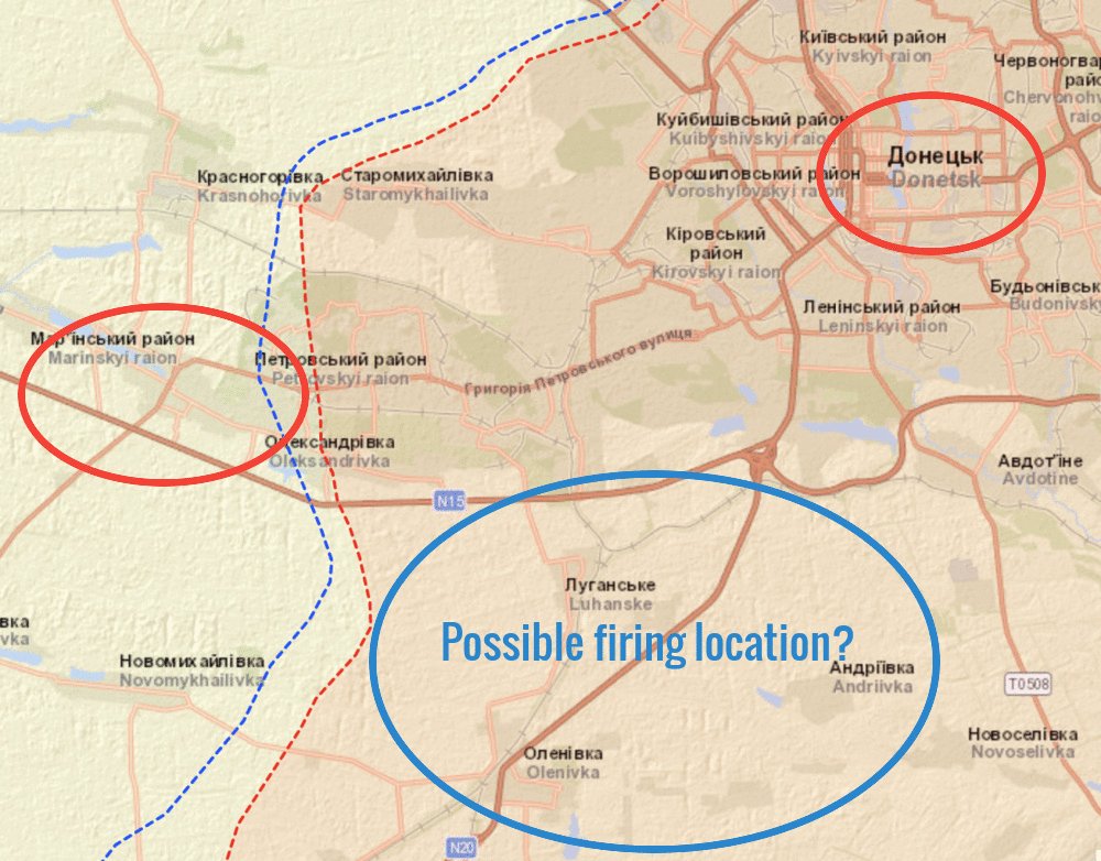 As this map shows, Mariinka is south-west of Donetsk city centre. The Grads hitting Mariinka are likely firing from the countryside somewhere around Luhanske and Olenikva, or east of there. There's no reason why they should be east of Donetsk city or be fired over the city. /17