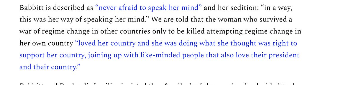 Babbitt was described as “never afraid to speak her mind” and her sedition: “in a way, this was her way of speaking her mind.” We are told that the woman who survived a war of regime change in other countries only to be killed attempting regime change in her own country 👇🏽