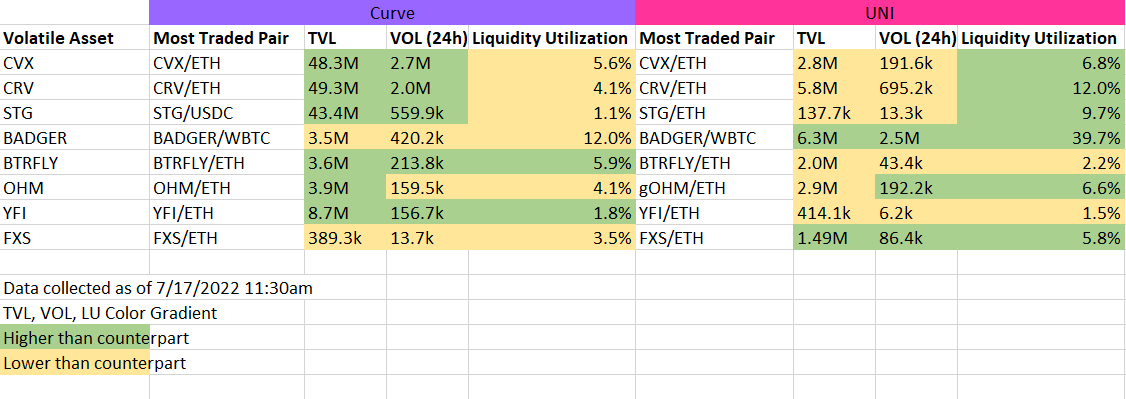 Summary: For TVL and slippage, Crv performs similar/better to Uni for most long-tail* and pegged assets. For VOL, Curve loses mostly on ETH/BTC and stables while winning synths.