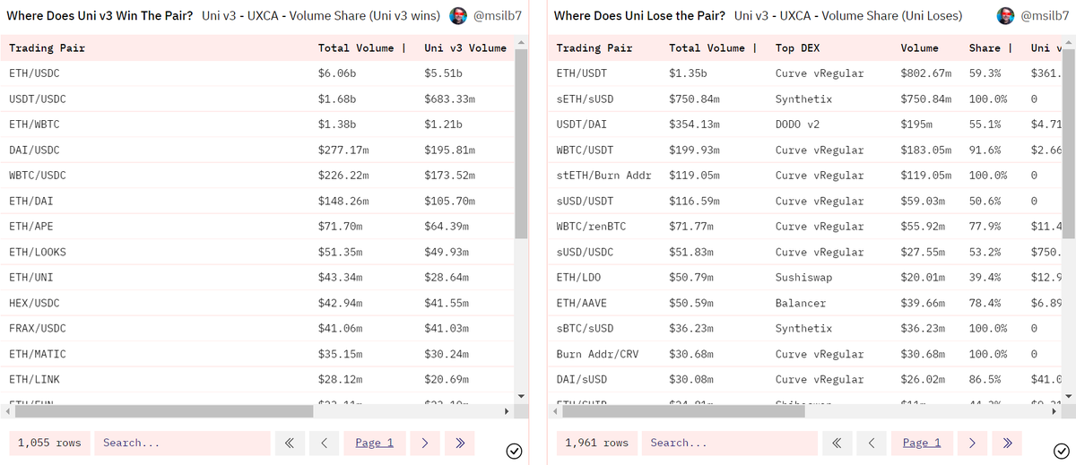 >> Volatile Pairs 5/x However, stables are only 14% of UniV3’s volume in the psat year. For major volatile pairs like ETH/BTC/USD, Uniswap is an unequivocal hegemon, crashing the hard-fought gains of Curve's tricrypto pool in every aspect.