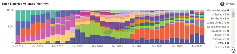 b) Curve has not won the heart of retail: Despite Curve only having ~24% of Uniswap’s volume, a higher percentage of 1inch dex aggregator’s volume routes through Curve, which is indicative of both Curve’s efficiency and its disproportionately fewer users.