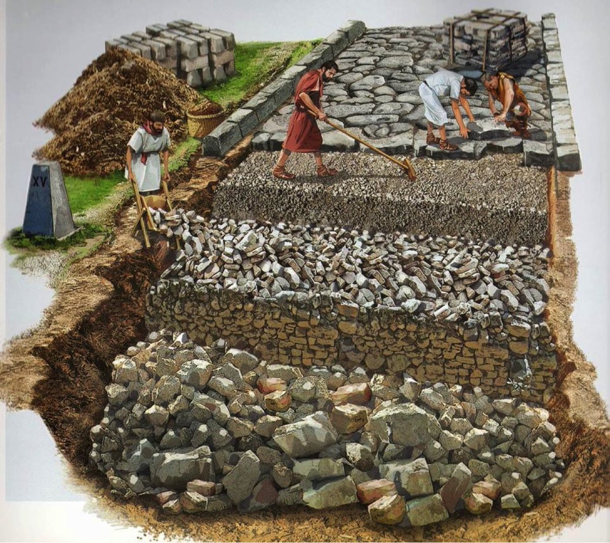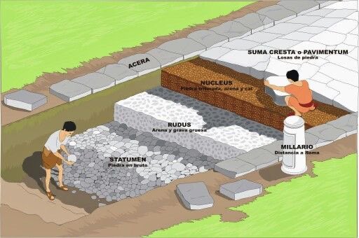 7. 3. Delimitación de la anchura de la calzada mediante bordillos. 4. Cimentación, la construcción en sí. Entre los límites marcados o bordillos se colocaba piedra que cimentaba el firme. 5. Las capas intermedias se rellenaban de arena o grava con ⤵️