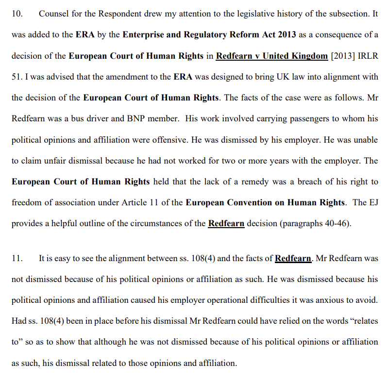 7/ The EAT took a narrow view of that exception. Its purpose was self-evident from its terms & directed towards dismissal due to political opinion or political affiliation. s.108(4) was brought in to comply with the ECtHR judgment in the BNP bus driver case of Redfearn v UK.