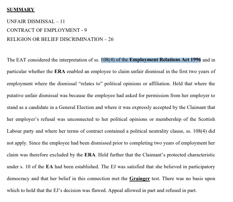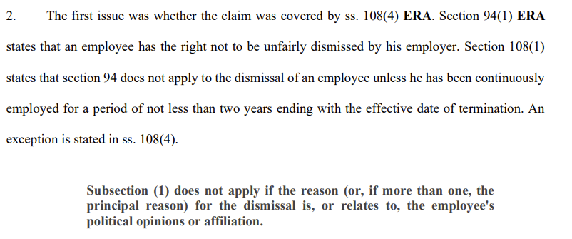 8/ Thus the EAT distinguished between dismissal due to particular opinions/affiliation on the one hand & dismissal not directed to that particularity but due to a political neutrality policy on the other. The s.108(4) exception doesn't apply to the latter.