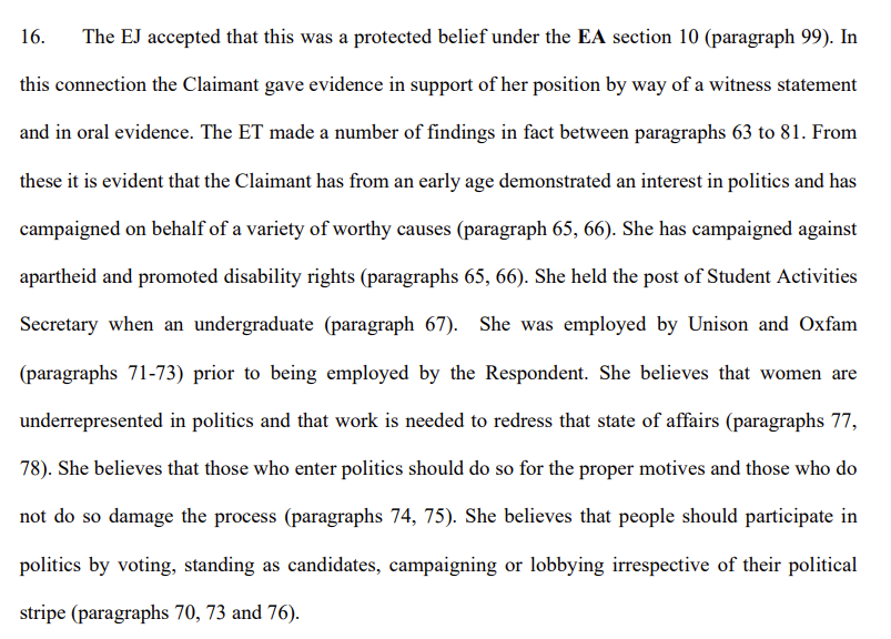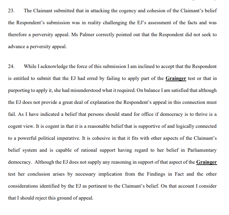9/ The EAT moved on to consider whether J's belief that those with relevant skills, ability & passion should participate in the democratic process fell within s.10 EqA as per the Grainger test. It found that it did, noting J's long history of such participation.