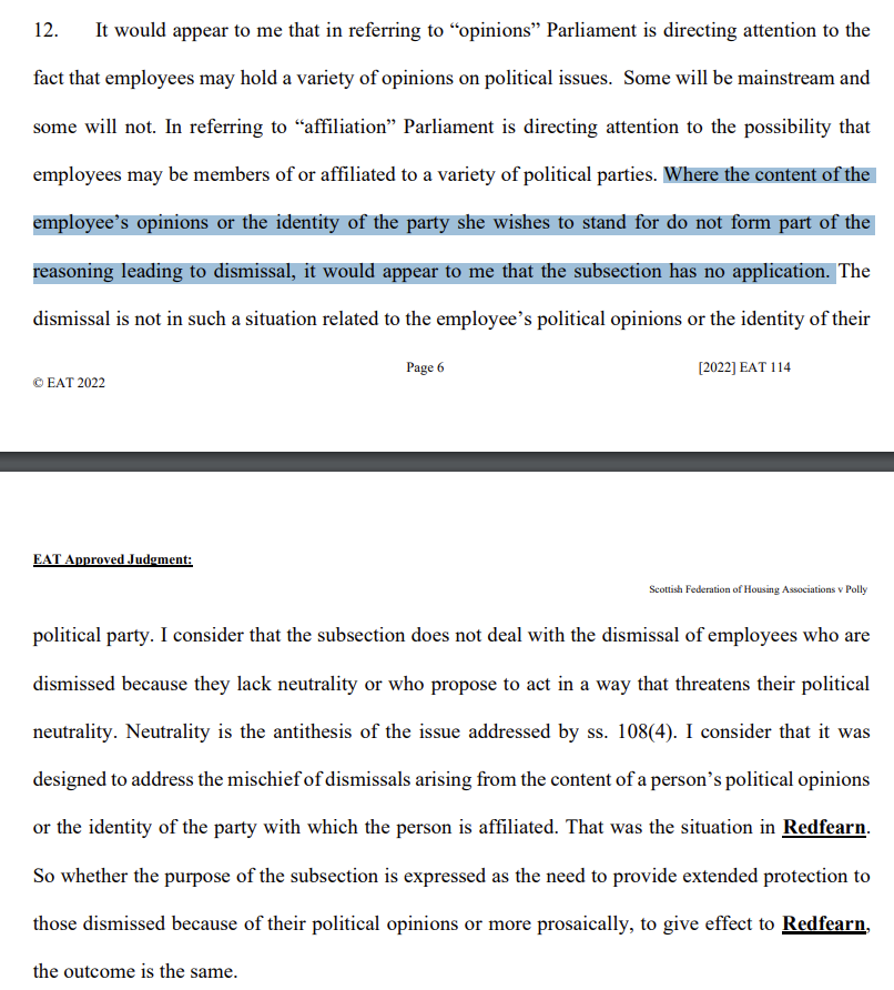 1/ Scottish Federation of Housing Associations v Jones: The exception to the 2 years qualified service requirement under s.108(4) ERA concerns dismissal for political opinions/affiliations & not mere breach of a political neutrality clause. assets.publishing.service.gov.uk/media/62dad6c0… #ukemplaw