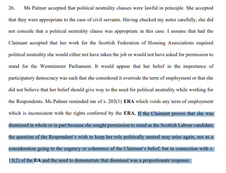 11/ In a curious part of the postscript, Lord Summers suggests that if J proves her dismissal due to seeking permission to stand for Scottish Labour, SFHA might need to address proportionality of dismissal under s.13(2) EqA. That's obviously wrong as this isn't an age case.