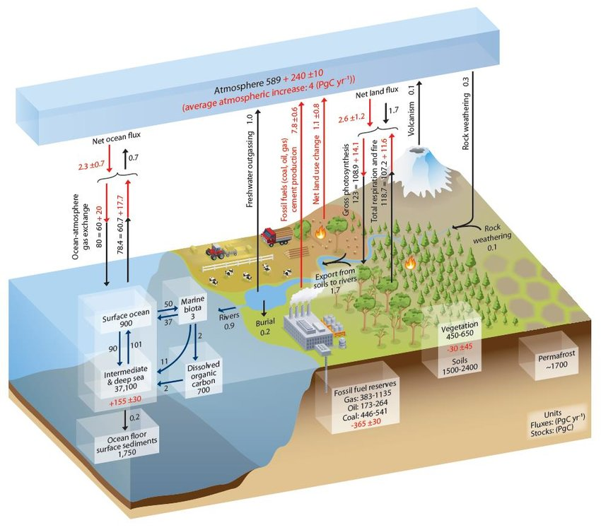 En esta imagen resume el IPCC el ciclo del CO2 con sus fuentes y sumideros . En rojo tenéis las alteraciones que está realizando el ser humano promediada entre 2000 y 2009 y lo acumulado desde 1750 en depósitos researchgate.net/figure/Simplif…