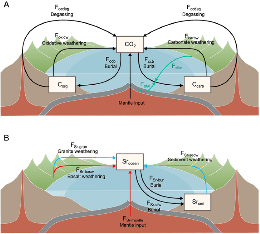 El agua de lluvia reacciona con el CO2 y forma ácido carbónico, que luego erosiona rocas como silicatos y carbonatos. De alguna manera, las rocas acabarán en la superficie del océano (arrastradas por ríos por ejemplo). La superficie se elimina por subsidencia de la corteza.