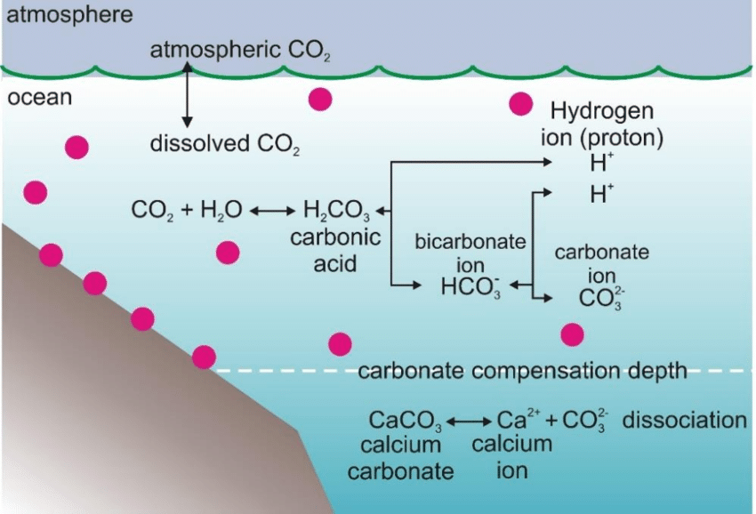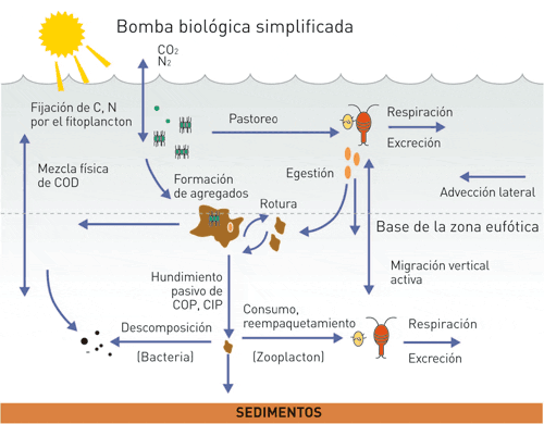También hay que tener en cuenta la presencia de los organismos fotosintéticos como el fitoplacton, que convierten el CO2 en carbono orgánico disuelto (DOC). Esta materia orgánica acaba en las profundidades de los océanos. Esto se conoce como bomba biológica.