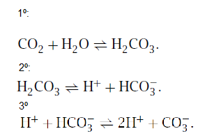 1º el CO2 gaseoso reacciona con el agua (H2O) para formar ácido carbónico (H2CO3). También llamado CO2 disuelto.