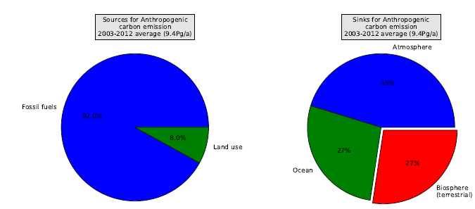 Extra 1, las fuentes (izquierda) y sumideros (derecha) de CO2 a corto plazo. Observad lo que se queda los océanos. De ahí su importancia en la absorción de CO2.