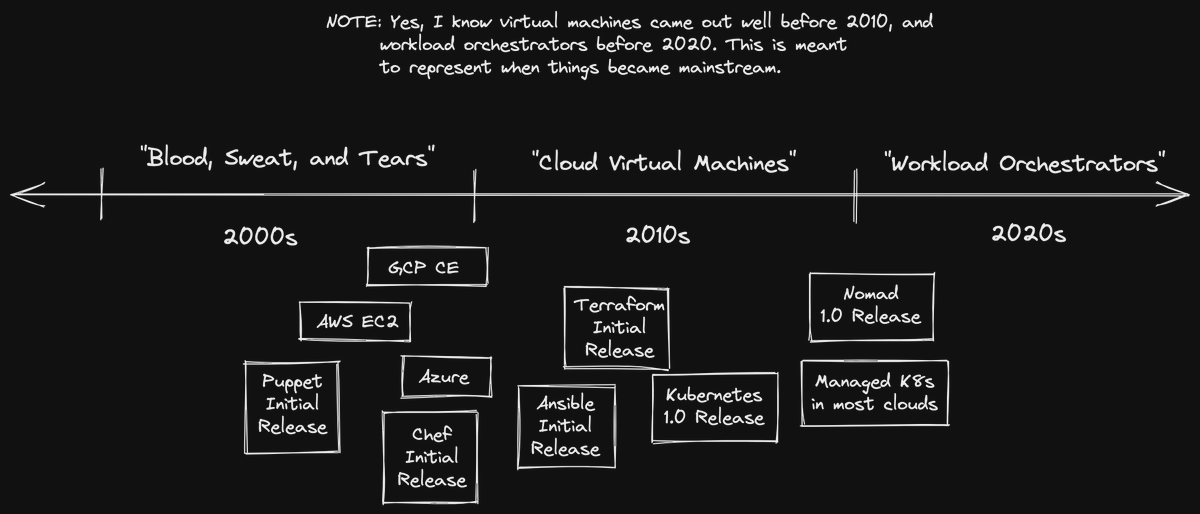 The tooling to manage large fleets of servers and applications simply didn't exist, so you would often hire a team of system administrators, who would end up rolling their own tooling in the form of Bash or PowerShell scripts! ๐