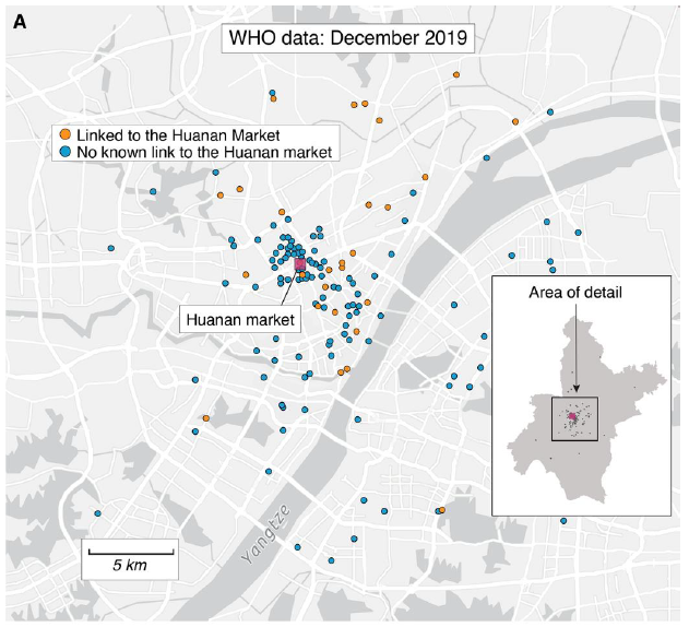 Let's start by looking at a map. These are the earliest cases on record. They cluster around the Huanan market and not the WIV, which is on the other side of the Yangtze River.