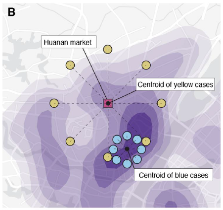 This shows the center points of Wuhan population density & Dec cases regardless of market association or not & virus lineage. The virus center points are all strongly linked to the market, while population is not.
