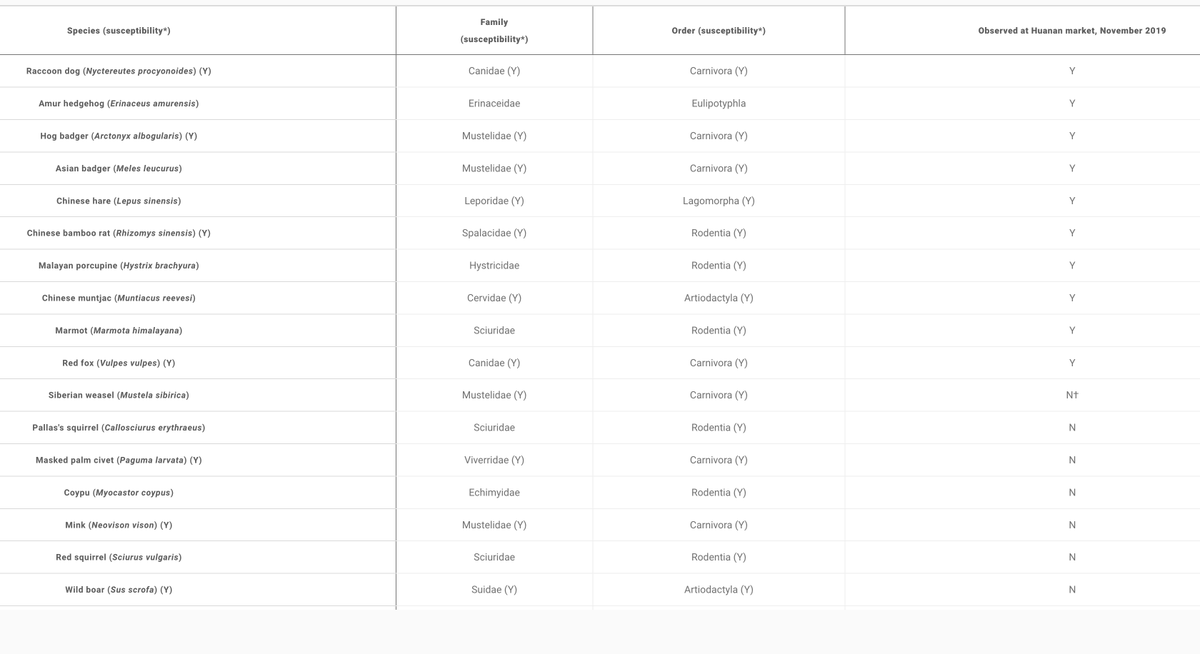 We also know there were multiple animal species that are known to be susceptible to SARS-CoV-2 being sold at Huanan in November and December 2019. That includes raccoon dogs & red foxes, as well as other animals likely to be susceptible like badgers, hares, hedgehogs, & muntjacs.
