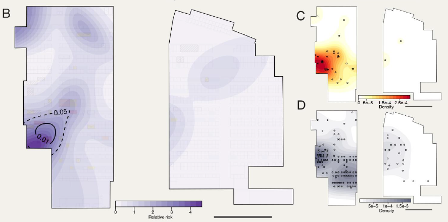 When we look at the distribution of positive samples in the market, we see that they are overwhelmingly associated with the west side where animals were sold, in the corner where the stalls sold animals.