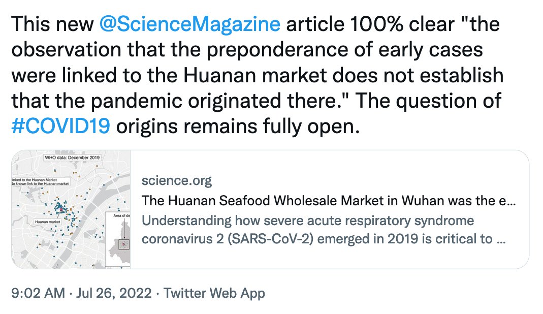 Our article makes it 100% clear the pandemic originated at Huanan market. We present the evidence & it passed peer-review.