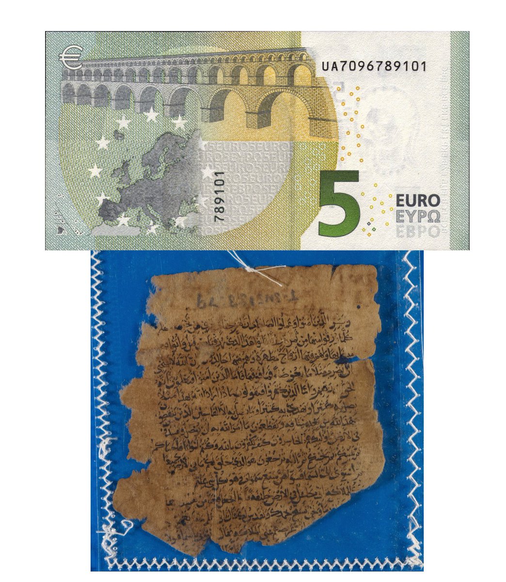 4/These fragments come from 25 separate manuscripts, overwhelmingly small “personal-use” texts. Some are only a few inches wide. These are not the large model codices typically cited in Islamic codicology. For example, relative size compared to 5 euro note: