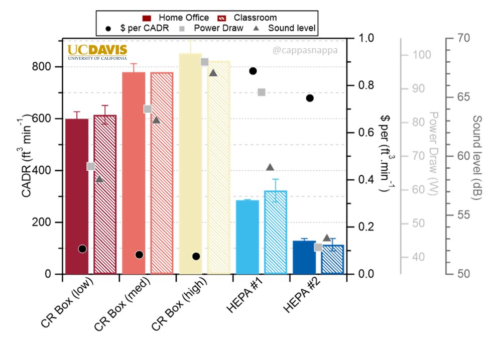 1/ Despite its very high clean air delivery rate (CADR) - see below - that can significantly lower inhalation dose of virus-laden repiratory (and other) aerosol particles in shared air when occupants are present, the #CorsiRosenthalBox also helps between occupancies.