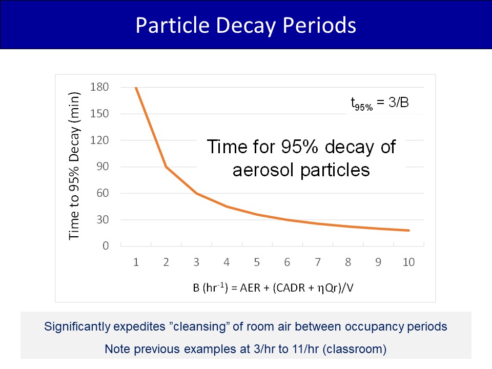 2/ Example for typical (approx average)-sized HS classroom we studied in Central Texas, but also applies to many K-8 classrooms during lunch periods/recess. How long does it take to purge a reasonably well-mixed (assumption more valid w/ CR box) of 95% of aerosol particles?