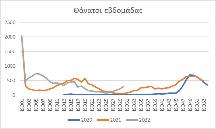 Hint: είμαστε πάνω από την αντίστοιχη περίοδο του 2021 όταν η Δ ήταν ήδη στο 90% επικράτηση (στοιχεία γονιδιωματικής 12/8/21 για εβδομάδες ISO29-30), αλλά σημαντικά λιγότεροι από την αρχή του 2022 (Δ+Ο1)