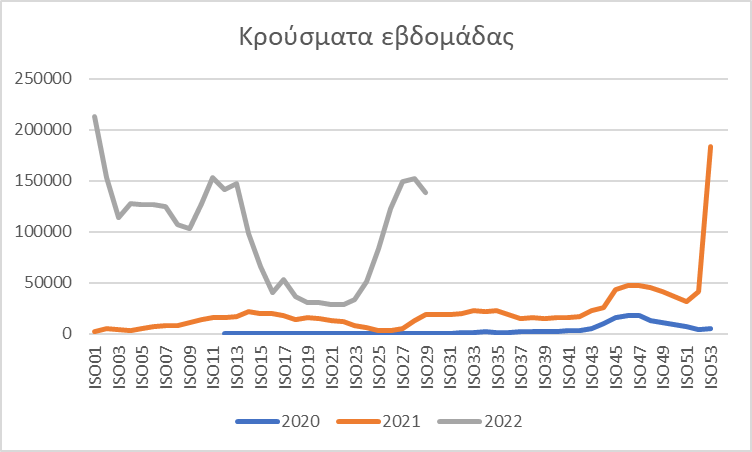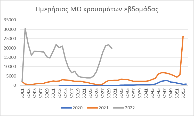 Κρούσματα - σύνολο εβδομάδας κ ημερήσιος μέσος όρος κρουσμάτων για την εβδομάδα.