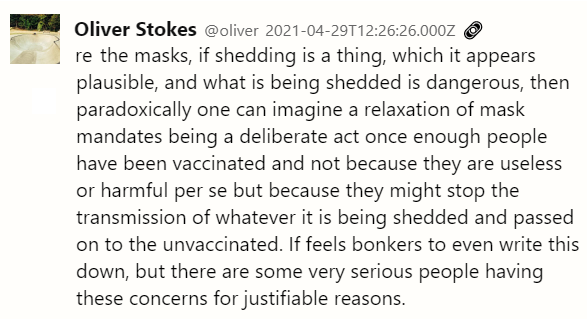 This paranoia took its toll. One member asked if he should stop his vaccinated sister holding his baby in case she shed on it! Ros Jones and Clare Craig both advised him to steer clear. So masks and social distancing don't stop covid spreading but do protect you from vaccines? 🤔