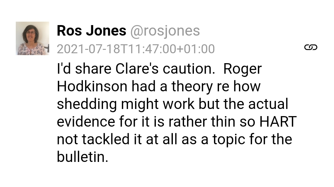 Many HART members believe that covid vaccines cause "shedding". Basically, they think vaccinated people walk around in a cloud of spike proteins that can "infect" those around them. They blamed everying from unusual periods to rising covid cases on alleged "vaccine shedding".