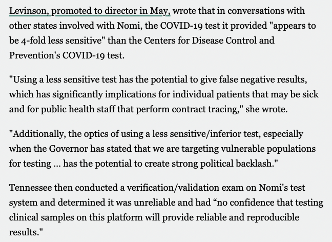 Tennessee health officials found the Nomi tests were "4-fold less sensitive" than the tests provided by the CDC. Further evaluation found Nomi's testing system was "unreliable" #utpol