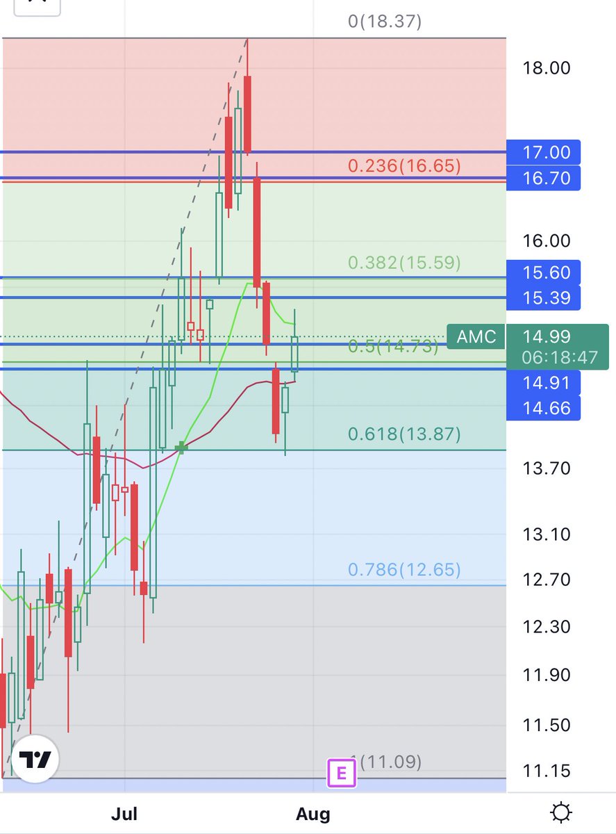 $AMC saw some of these levels yesterday play out as we quickly saw the gap above get filled and hit the $15.05 fib level with a high of $15.29 (low of day $14.20) — markets then slumped quickly after the bell as reaction to the GDP report and from the FOMC pump on Wednesday.
