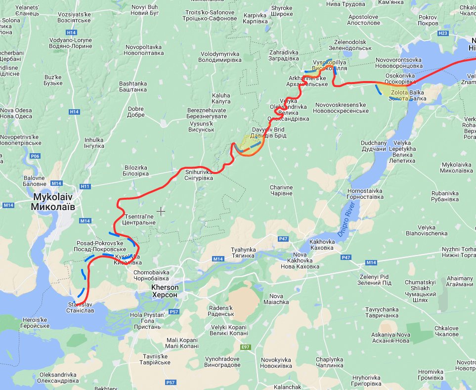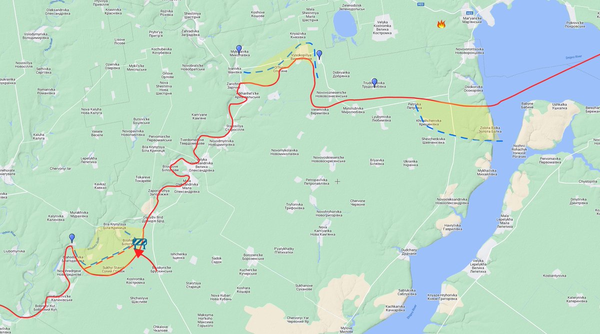 Northern Kherson. The AFU blocked a RU attack in the Bilohirka. It seems like the Ukrainian forces want to keep this bridge head. This area gives fire control over the T2207 probably used to supply the RuAF in the Vysokopillya area.