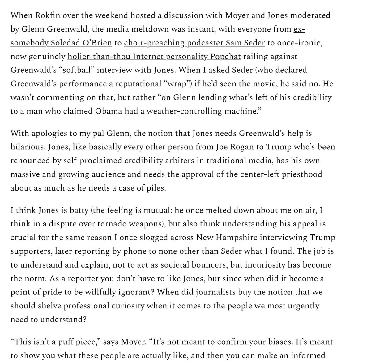 Separately, Taibbi interviews Moyer about her interest in outcasts (incels and Jones), and why journalists can't understand her films: because she does *journalism*, showing viewers the truth and lets them decide, rather than performatively denouncing: