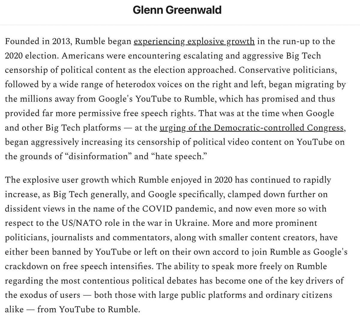 Rumble has experienced massive growth since mid-2020, when millions began migrating away from YouTube due to anger of Big Tech's escalating pre-election censorship. That growth has only intensified with increasing Google censorship over COVID, 1/6 and Ukraine.