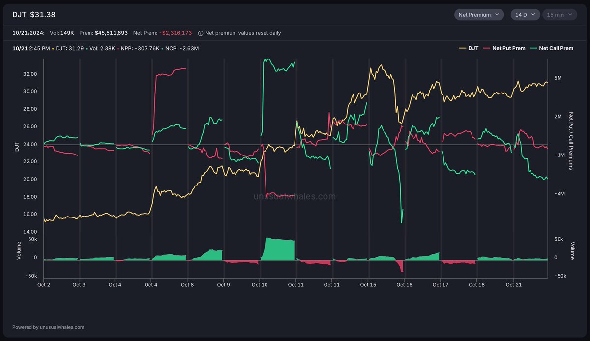 $DJT historical net flow using @unusual_whales we can visualize the net call premium and net put premiums over the past 14 days as #DJT continues to rally in stock price