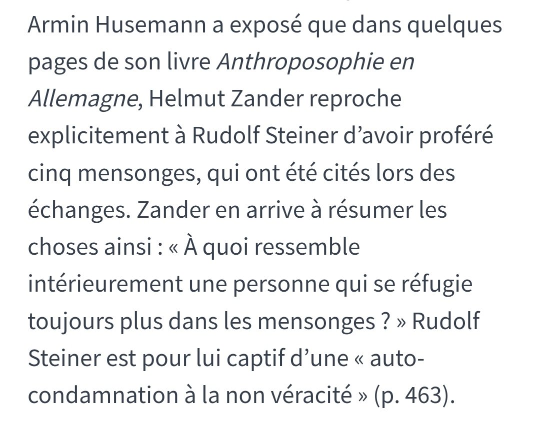 La première catégorie, ce sont les universitaires critiques de l'anthroposophie. On y trouve nommé Helmut Zanger, qui se voit traiter d'adversaire pour avoir osé dire... que Steiner a menti cinq fois dans sa vie. (perso j'aurais dit bien plus, mais admettons).