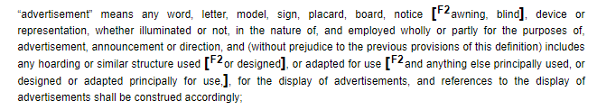 The display of advertisements in England is controlled by the Town and Country Planning Act 1990 and the Town and Country Planning (Control of Advertisements) (England) Regulations 2007. 'Advertisement' is defined very broadly in the Act: