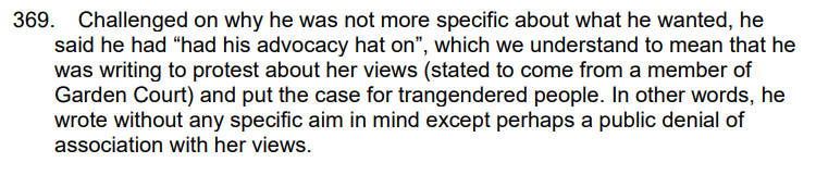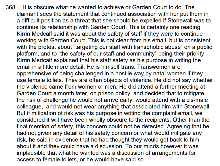 When KM was asked why he had sent this email, one of his explanations was that he was concerned for the safety of trans people who might visit GCC in the future. That explanation was disbelieved by the ET, which described KM’s reasons as ‘obscure’.