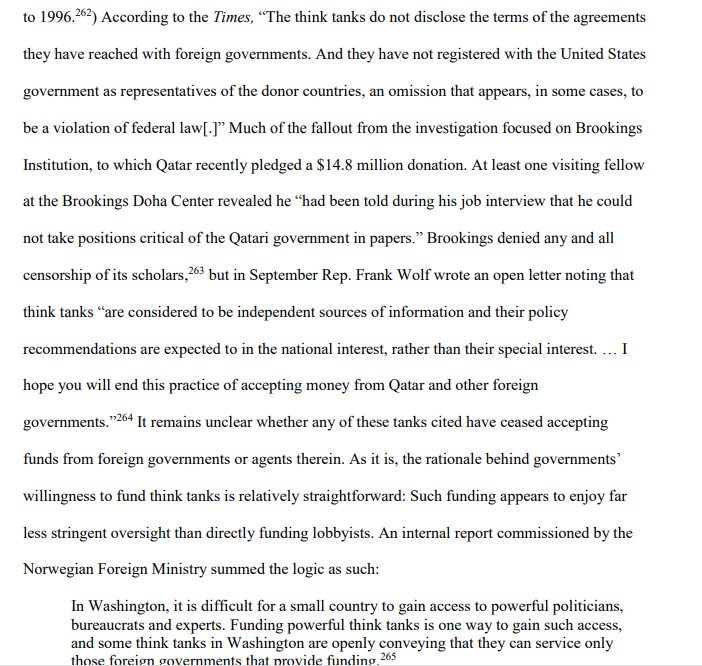 Brookings' suspect relationship with Qatari money made a cameo in my Master's thesis in the mid-2010s, on how American think tanks had transformed into lobbying vehicles for foreign governments: