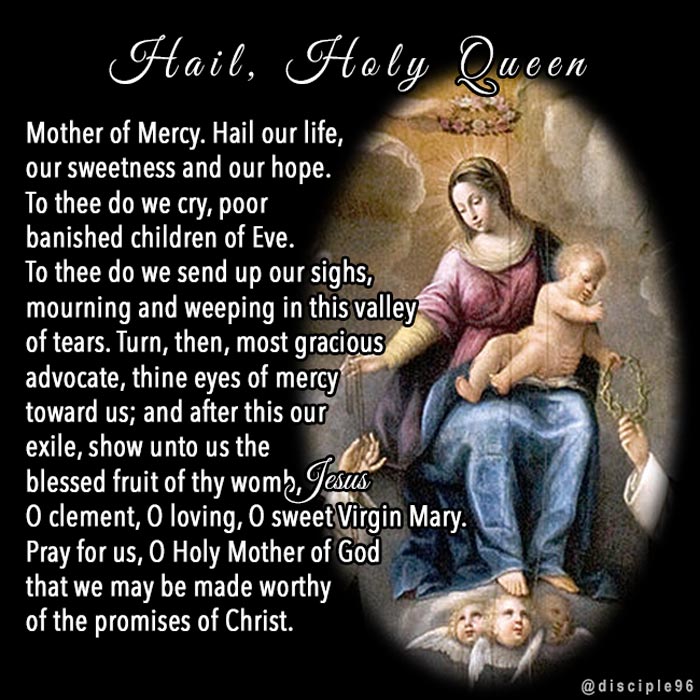Hail, Holy Queen, Mother of Mercy, Hail, our life, our sweetness, & our hope. To thee do we cry, poor banished children of Eve. To thee do we send up our sighs, mourning & weeping in this valley of tears…