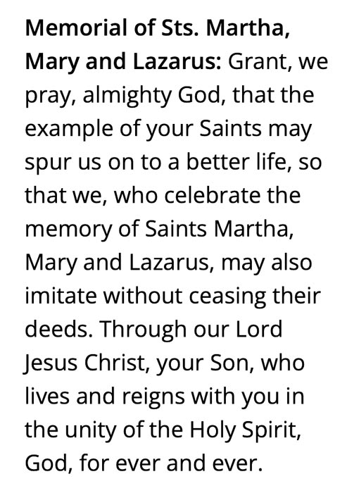 Precious Blood of Jesus, wash away our sins. Saints Martha, Mary & Lazarus, pray for us!
