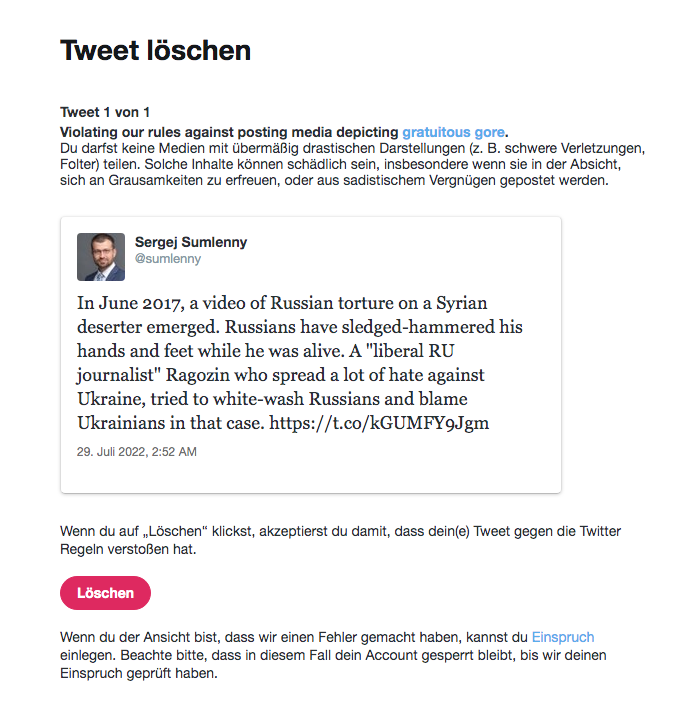 Twitter blocks my account because of a tweet in which I reveal how Russian anti-Ukrainian "journalist" Ragozin tried to white-wash Russian soldiers who tortured and kill a Syrian deserter, and blamed Ukrainians instead. Good reason to repeat this THREAD according Twitter rules