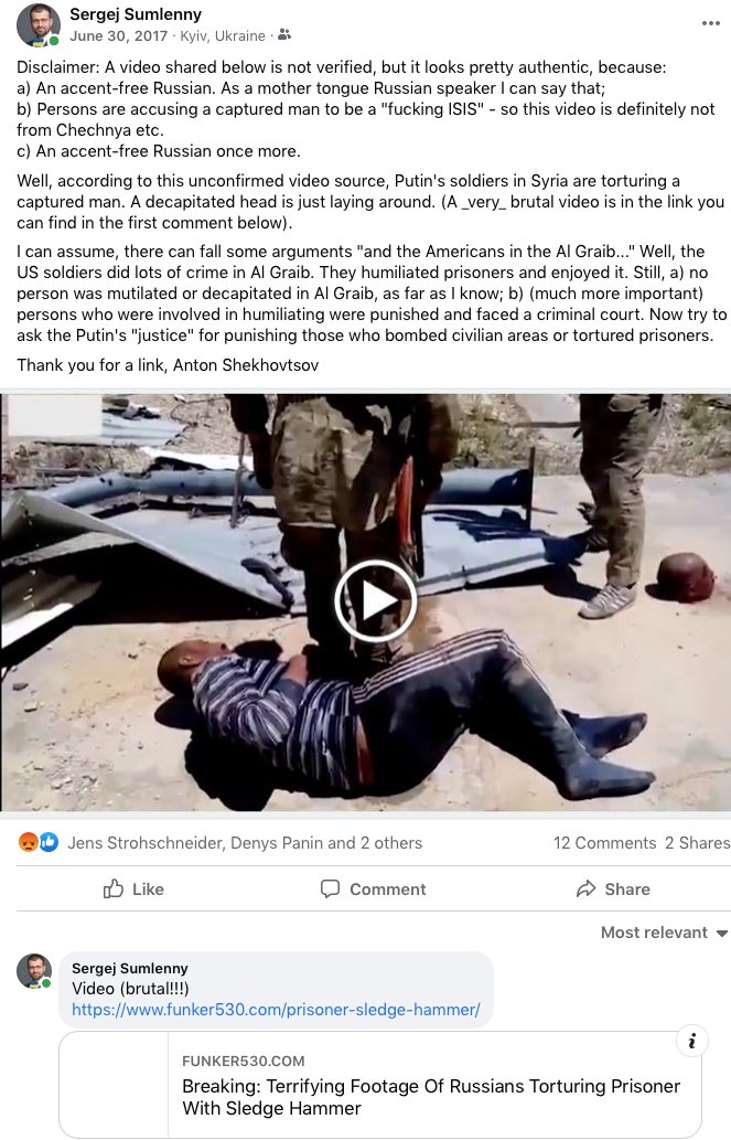 In June 2017, a video of Russian torture on a Syrian deserter emerged. Russians have sledged-hammered his hands and feet while he was alive. A "liberal RU journalist" Ragozin who spread a lot of hate against Ukraine, tried to white-wash Russians and blame Ukrainians in that case.