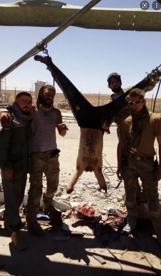 A year later, a full video of the torture leaked. Russians have killed the Syrian deserter, cut off his hands and head, wrote on his body "Glory to Airborne Troops" and burned the rest of the body on a bonfire. Russian GRU Wagner spetznaz made this sledgehammer torture to advert.