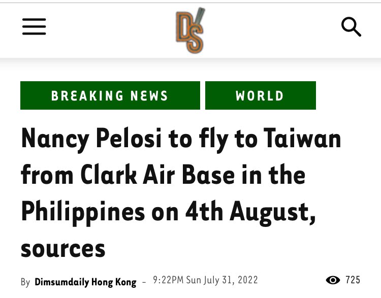 Secondo l'itinerario ufficiale, le tappe del viaggio confermate si limitavano a Giappone, Corea del Sud, Singapore e Malesia. Taiwan non è stata menzionata nel comunicato stampa, dove si asseriva che l'itinerario era "relativo alla sicurezza". dimsumdaily.hk/nancy-pelosi-t…